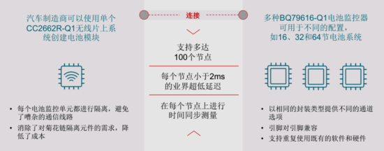 考虑到主机厂的长期设计需求,无线 BMS 创新技术还提供更高的可扩展性。专有协议可提供市场上最高的吞吐量,使主机厂能够在不同电池配置中(如 32、48 和 60 个电池单元的系统等)将采用单个无线片上系统的电池模块与多个 BQ79616-Q1 电池监控器相连。这样的系统设计支持多达 100 个节点,每个节点都达到业界最低延迟(低于 2ms),且每个节点的测量均可实现时间同步。