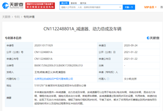 2021年01月25日 | 华为公布“减速器、动力总成及车辆”新专利
