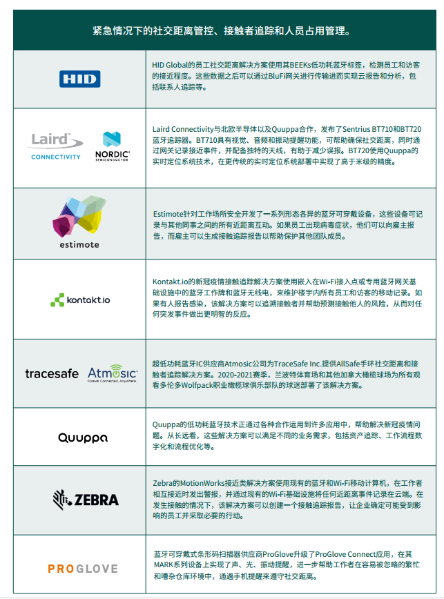 此外,其他解决方案供应商对已经部署的蓝牙设备进行了调整,以帮助执行社交距离管控措施。许多 实时定位系统供应商已在他们的软件平台上加入了近距离感测(proximity sensing)和接触者追踪 (contact tracing)功能,从而追踪当前在企业、医疗和工业环境中部署的蓝牙实时定位系统设备。 这种解决方案的一个优点在于可以快速且有效地部署,而不需要安装更复杂、更广泛的实时定位系统 基础设施。此外,还可以使用智能手机、数据采集器、网关或支持蓝牙的Wi-Fi接入点来实现云报告、 接触者追踪和其他有价值的分析。在新冠疫情隔离期间,这一点非常重要,因为越来越多的传统实时 定位系统供应商难以在现场部署和配置其解决方案。