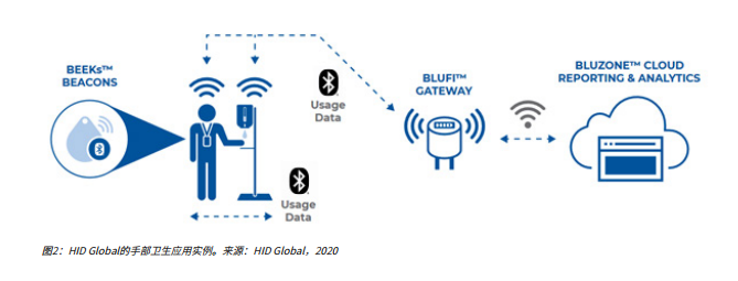 以下是HID Global提供的一个手部卫生蓝牙解决方案的例子。通过将蓝牙beacon集成到饮水机内,员工身上的标签或工作牌便会监控每次使用情况,并对事件进行记录,随后通过网关上传到云端。