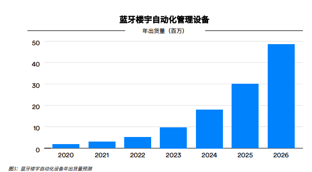 蓝牙商业照明解决方案预计将成为未来几年增长最快的无线解决方案,到2026年,其年出货量将增长至600万以上,并实现130%的复合年增长率。如图3所示,随着用例的不断发展,暖通空调、照明、访问控制和无线传感器内的蓝牙楼宇自动化管理设备将在未来几年内快速增长,设备出货量将从2020年的约170万增加至2026年的近5,000万。
