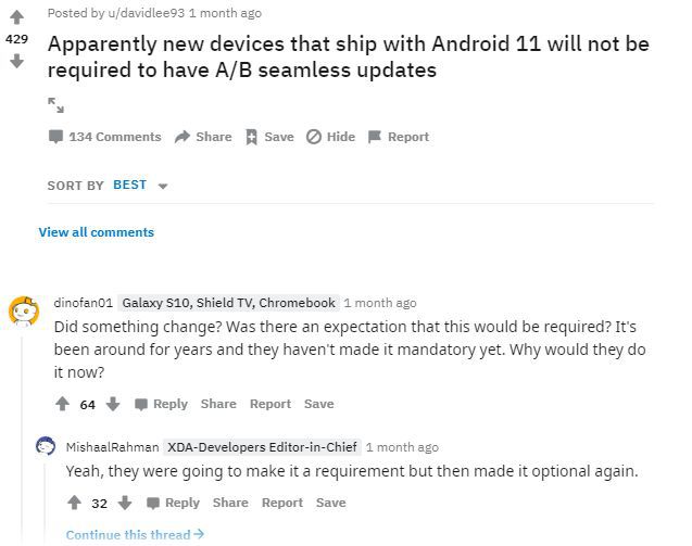 然而早在上个月,Reddit 网友 u / davidlee93就预料到谷歌不会强制要求所有预装 Android 11的新机支持 A / B 无缝更新。