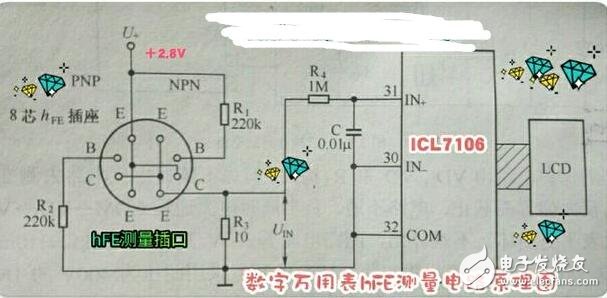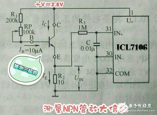 被测NPN型三极管插入NPN插口后,与图中的R1、R2及RP构成一个简单的放大电路。由于模数转换器ICL7106的COM端与U+端之间是一个稳定的+2.8V(此电压为ICL7106内部基准电压源产生)电压,RP为万用表hFE档的校准电位器,一般调整其阻值,使测试电流IB为10μA。R2为取样电阻,一般取值10Ω。我们知道,三极管的IE=IB+IC(这里忽略三极管的Iceo,因为现在的管子皆为硅三极管,Iceo一般在nA级,可以忽略不计)。