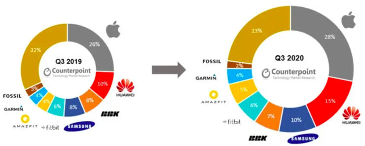 市场调研机构 Counterpoint 在 2020 年 12 月公布的 2020 年第三季度全球智能手表调研报告中指出,市场排名前 8 的品牌分别为:
