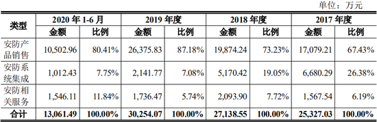 而主营业务几乎是其全部营收来源。2017年—2020上半年,其主营业务营业收入分别为2.53亿元、2.71亿元、3.03亿元和1.31亿元。其中,安防产品销售收入分别为1.712亿元、1.99亿元、2.64亿元和1.05亿元,占其主营业务收入比例分别为67.43%、73.23%、87.18%和80.41%。