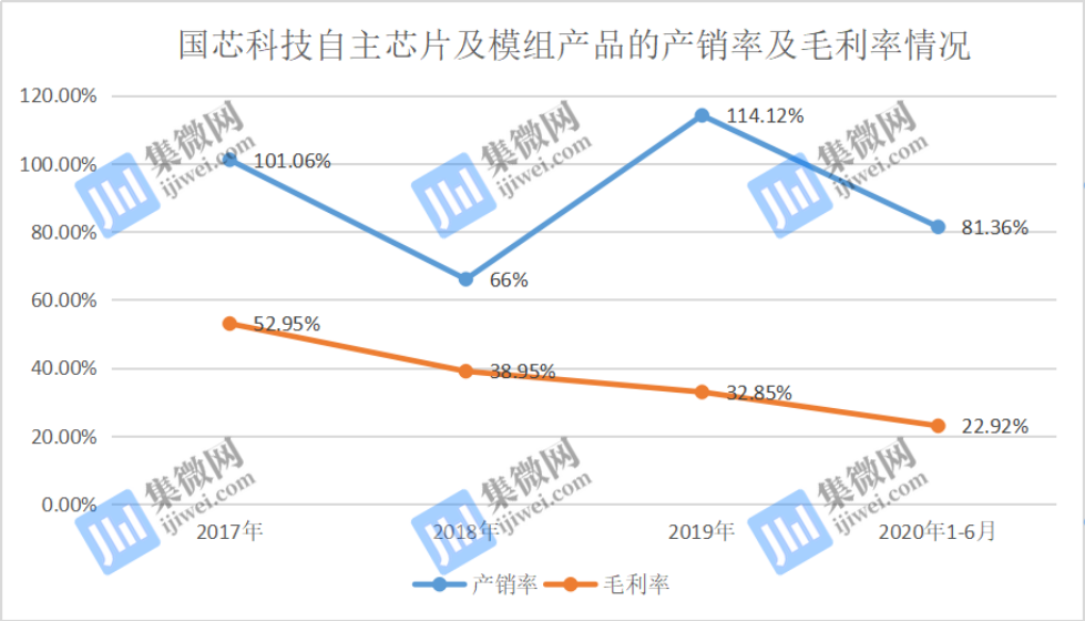 另外,国芯科技自主芯片及模组产品的产销率也出现较大的波动。从2017年101.06%,到2018年下降至66%;再到2019年上升至114.12%,2020年1-6月又下滑至81.36%。同时,报告期内,其毛利率分别为52.95%、38.95%、32.85%、22.92%,呈现下滑趋势。