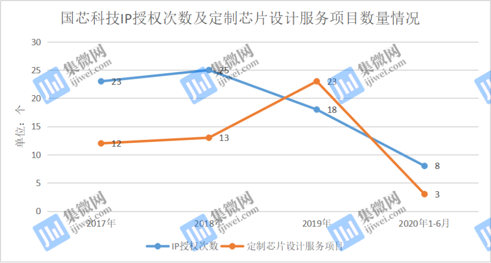 2017年至2020年1-6月,国芯科技完成 IP 授权次数分别为23个、25个、18个、8个;完成定制芯片设计服务的项目数量分别为12个、13个、23个、3个,均出现较大的波动。