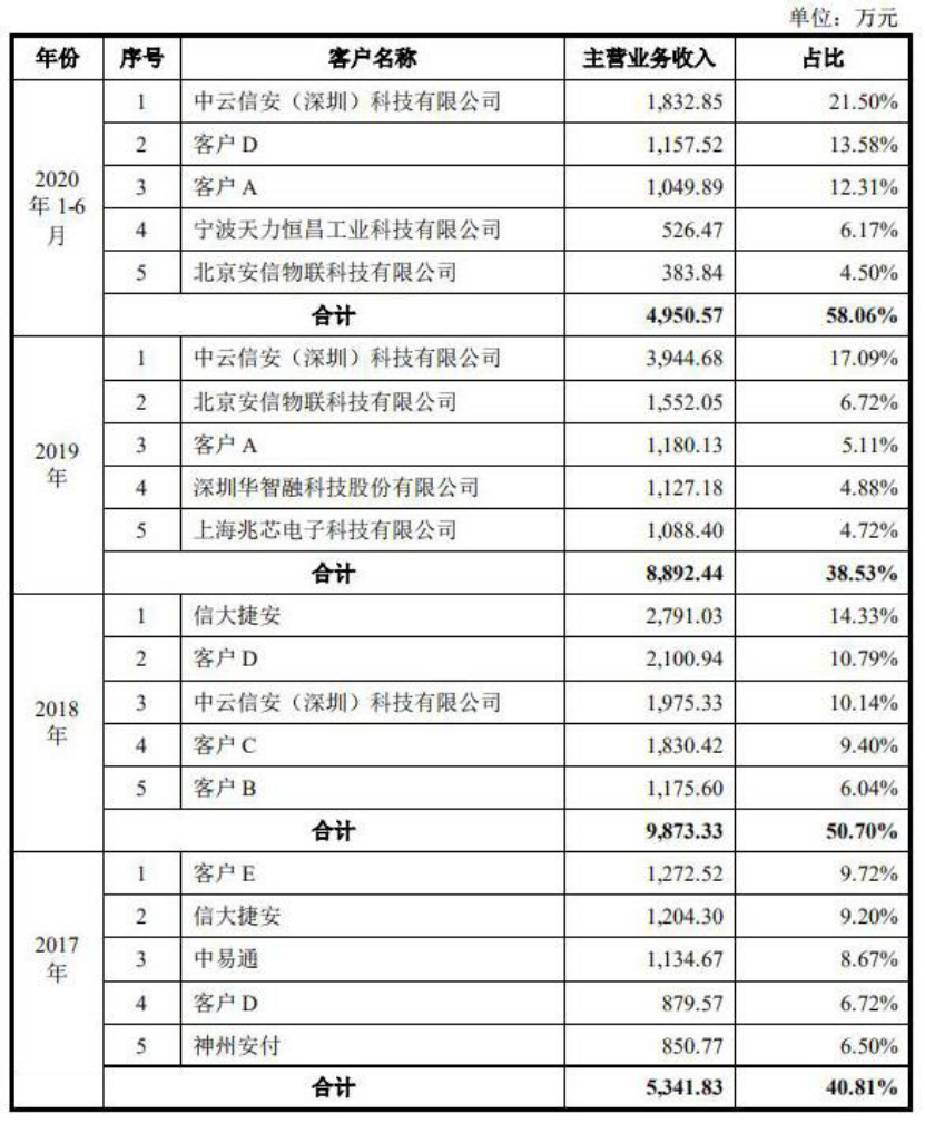 到了2019年,其客户体系再次出现大变动,仅中云信安(深圳)科技有限公司在前五大客户名单中,新增客户包括北京安信物联科技有限公司、客户A、深圳华智融科技股份有限公司、上海兆芯电子科技有限公司。
