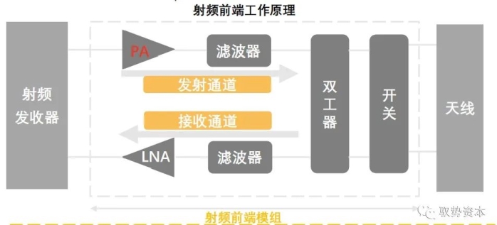(2)在信号接收过程中,将电磁波信号转换成二进制数字信号。射频前端的信号传输路径分为发射通道和接收通道,其中,发射通道路径为“基带芯片-射频收发模块-开关-PA-滤波器/双工器-开关-天线-信号”;接收通道路径为“信号-天线-开关-滤波器/双工器-LNA-开关-射频收发模块-基带芯片”。