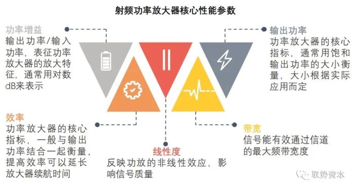 射频功率放大器指标包括带宽、输出功率、效率、线性度及功率增益。输出功率与效率为射频功率放大器核心技术指标,提高输出功率和效率是射频功率放大器重要设计目标。每一次通信技术的升级都对射频功率放大器的性能提出更高要求。