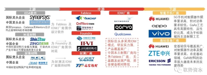中国射频产业起步较晚,尚未出现具备射频器件生产全流程工艺的企业,更多采用“Fabless+Foundry+封测厂”的垂直整合模式分工协作。