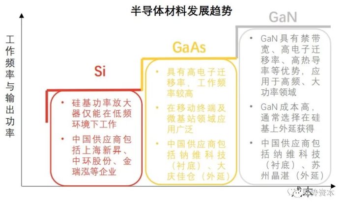 Si材料射频功率放大器主要应用于2G、3G时代低频领域,而在5G时代,Si材料功率放大器将逐渐被GaAs及GaN功率放大器替代。