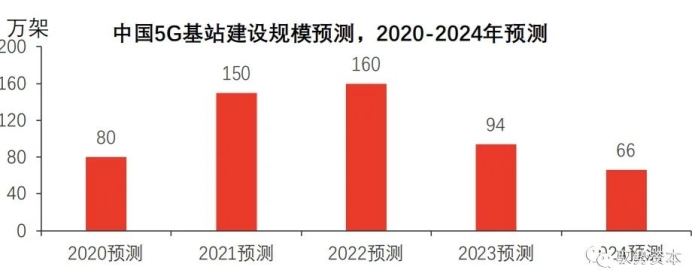 2019年市场处于4G向5G的过度阶段,2020年中国开始大规模建设5G基站,预计在2024年完成5G基站的基础建设,预计总共建设260万架宏基站及300万架微基站。