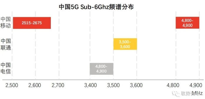 5G频谱分为FR1及FR2,FR1通常指Sub-6Ghz,对应的频谱范围为450MHz-6,000Mhz,主要应用于移动通信领域。FR2通常指毫米波频段,对应的频谱范围为24,250MHz-52,600MHz,应用于雷达及军事等通信领域。中国移动获得160M的2.6G频谱和100M的4.9G无线频谱,电信和联通分别获得的100M的3.5G频谱。因此5G时代,手机射频功率放大器需在2.6Ghz及以上频率工作。当前,中国本土企业生产的射频功率放大器最高工作频率为2.1Ghz,2.6Ghz及毫米波高频段功率放大器仍需依赖进口。