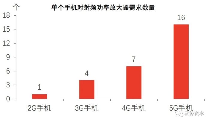 5G通信技术在4G的基础上新增更高频率的波段,而5G智能手机除需接收5G高频信号外,还需兼备可接收4G信号的能力,因此5G手机需配置多个射频前端模组接收不同频率的信号。4G多模多频手机需要5-7颗射频功率放大器,而5G智能手机配置的射频功率放大器高达16颗。