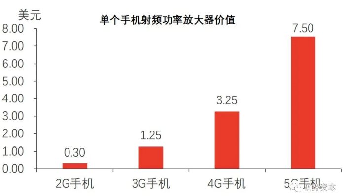 5G智能手机射频功率放大器的单价也有显著提高。单部2G手机采用射频功率放大器合计金额为0.3美元,每部3G手机在射频功率放大器上的平均花费上升到1.25美元,而全模4G手机射频功率放大器的费用则高达3.25美元,预计5G手机配置的射频功率放大器价值达到7.5美元以上。
