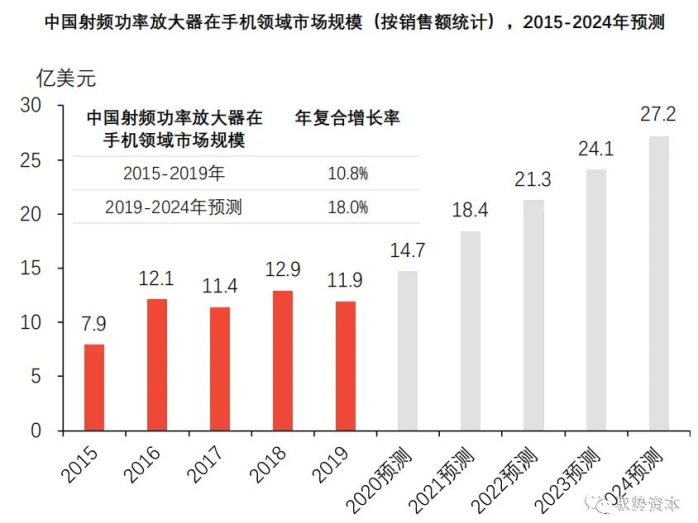 随着5G通信技术的升级,中国迎来换机潮,手机出货量将缓慢上升,对射频功率放大器的需求逐渐释放。