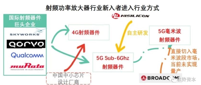 3、华为及英特尔等巨头企业为新入者,选择从sub-6Ghz频段进入射频器件行业。