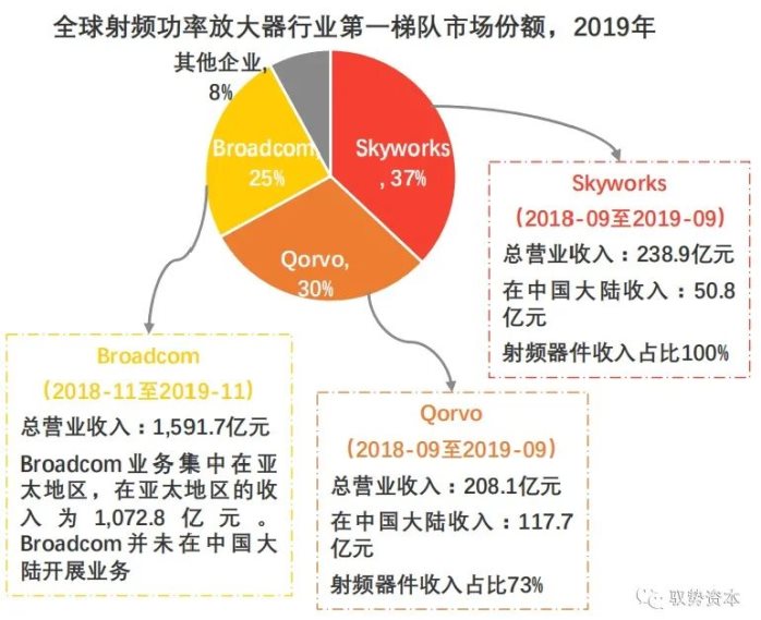 2019年,全球射频功率放大器市场主要被美国厂商垄断,前三大公司Skyworks、Qorvo及Broadcom合计市场份额约92%,为射频功率放大器行业第一梯队。