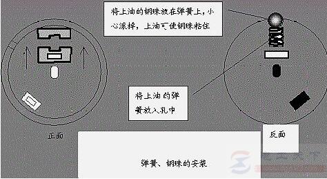 1、取出弹簧和钢珠,放入凡士林油中,将加上润滑油的弹簧放入电刷旋钮的小孔中,钢珠黏附在弹簧的上方。切勿丢失。