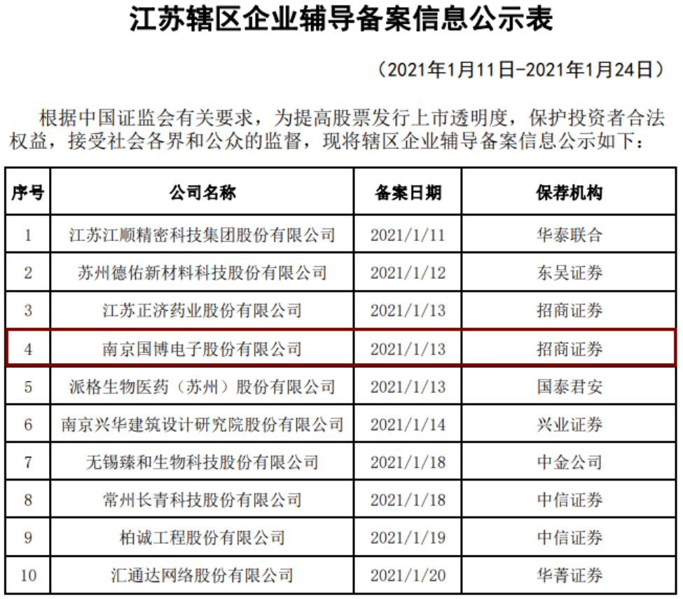 近日,据江苏监管局披露了其辖区辅导备案企业基本情况表显示,南京国博电子股份有限公司(以下简称:国博电子)拟首次公开发行股票并在境内证券交易所上市,现已接受国泰君安的辅导,并于2020年1月13日在江苏证监局进行了辅导备案。