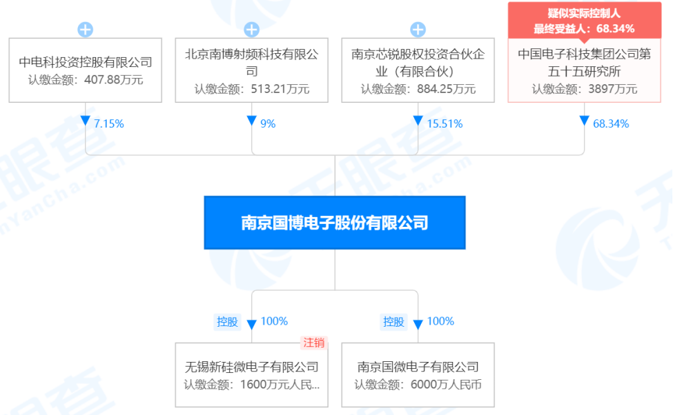 在股权结构方面,据天眼查显示,国博电子一共有四位股东,其中,中国电子科技集团公司第五十五研究所持有该公司68.34%股份,为其实际控制人。另外三位股东分别为南京芯锐股权投资合伙企业(有限合伙)、北京南博射频科技有限公司、中电科投资控股有限公司,持股比例分别为15.51%、9%、7.15%。