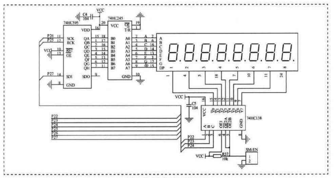 此讲的电路图如图2。从图2 中可以看出,驱动八个八段数码管总共用了6 个单片机IO 口,其中三个IO通过控制74HC595 来实现对数码管中的各段驱动,另外三个IO 通过控制74HC138 来实现对8 个数码管中的公共端驱动。此外为了增加74HC595 输出的驱动能力,在其输出后接了一级74HC245 芯片,以提高驱动能力,增加数码管的亮度。在这里对这三个芯片进行介绍说明。