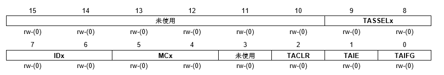 位 2 定时器_A 清零 将这些位置位复位 TAR,时钟分频器,和计数方向。 TACLR 位自动复位并且总是读取为 0。 TAIE 位 1 定时器_A 中断使能。 这些位启用 TAIFG 中断请求。