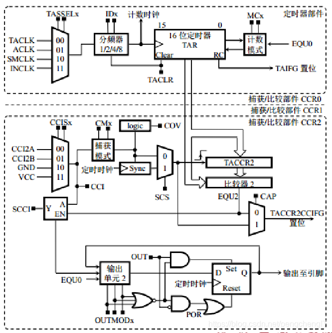 捕获功能单元由捕获信号选取(CCISx)、捕获方式选择(CMx)、同 步/异步方式选择(SCS)、捕获/比较寄存器(TACCRn)及其它辅助 部件组成。 每一个捕获功能部件可以接收两路外部输入信号CCIxA 与 CCIxB)和两路内部信号(VCC与 GND),控制位 CCISx 决定捕获功能部件的输入信号。控制位 CMx 决定捕获方式。控制位 SCS 决定异步捕获还是同步捕获。