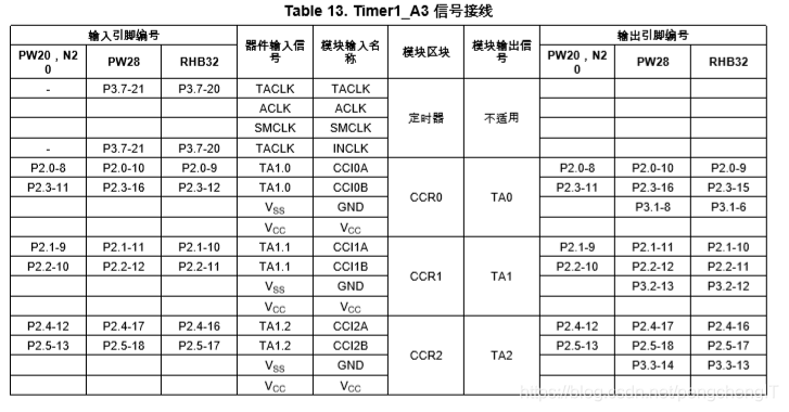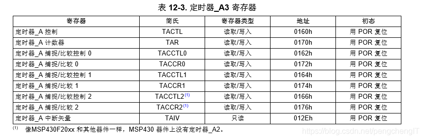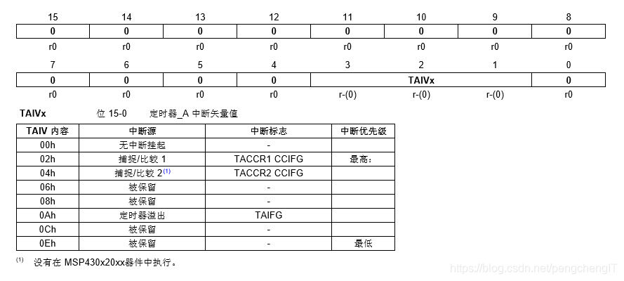 ② 比较/捕获 0 中断比较特殊,它独自拥有一个中断向量 (TIMER_A0_VECTOR),是单源中断。而定时器溢出中断和其它两个比较/捕获中断共享一个中断向量(TIMER_A1_VECTOR), 属于共源中断,中断向量寄存器(TAIV)。