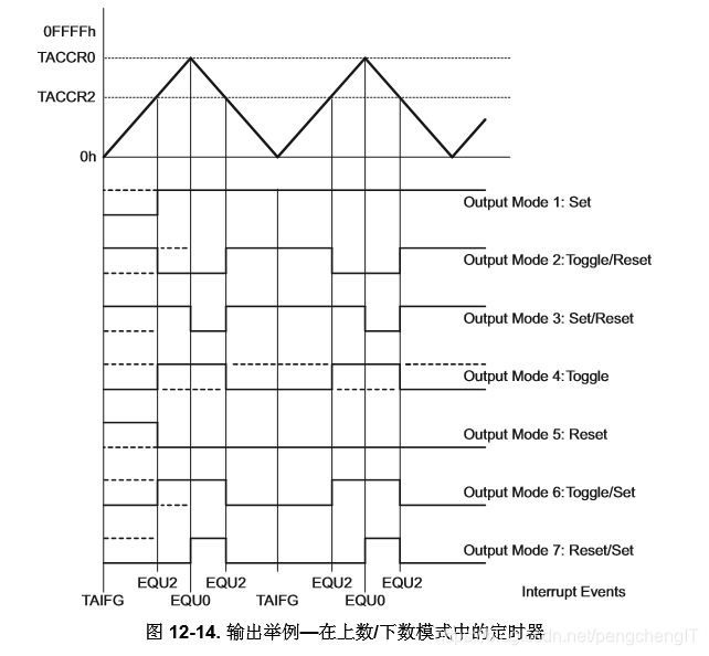 定时计数器首先从零增计数到TACCR0,然后再减计数到零,至此 完成一次循环。① 计数周期为 2× TACCR0 + 1。② 计数过程中可 分别使中断标志位 TAIFG 与 TACCR0 CCIFG 置位。
