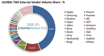 Strategy Analytics新兴终端技术(EDT)团队最新发布的研究报告预测, 2020年全球蓝牙耳机的总销量将超过3亿部。其中,真无线立体声(TWS)蓝牙耳机的销量增长了近90% 。报告提供了到2025年全球TWS蓝牙耳机、蓝牙耳机销量和收入的预测,报告还详细列出了2020年领先的TWS耳机厂商全球市场份额。