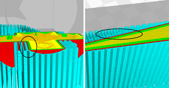 关于支撑间隙,笔者尝试良多。支撑间隙是模型与支撑间的距离,对模型成型效果及拆支撑难度影响较大的是Z轴方向即垂直方向的支撑间隙。支撑间隙与层高息息相关,支撑间隙的设置距离应为0.6~1.2*层高。当模型底面较为平缓时,可设置较大的间隙,减少拆支撑难度。当模型底面变化大时,应设置较小的间隙。