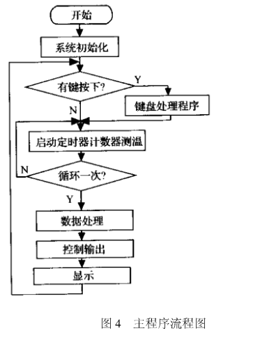 主程序流程图,如图4所示。开机后首先进行初始化操作,从EEPROM中调出T4、T3、T2、T1的温度值,如有键盘按下,则先执行相应的键盘处理程序,此后同时启动计数器和定时器,单片机对CD4052的通道进行选择就可得到相应的计数值,对于每一个通道进行3次采样取中间值,直至得到所有要求的温度计数值,然后对计数值进行相应的换算处理,根据仪器的要求输出相应的控制信号控制各继电器的状态。在程序设计中,为了防止跳闸操作的误动作,考虑到温度的变化是个缓慢过程,温度上升时必先到达风机启动温度T2,然后到达超温报警T3,最后到达超温跳闸温度T4,在输出超温跳闸控制信号前检验风机和超温报警继电器的状态。同时在硬件电路中,用与门实现风机启动控制信号、超温报警控制信号和单片机输出的超温跳闸控制信号相“与”作为真正的超温跳闸制信号控制继电器。