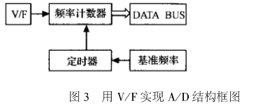 (3)便于远距离传输。V/F转换器实现A/D转换需要与频率计配合使用,电路框图,如图3所示。
