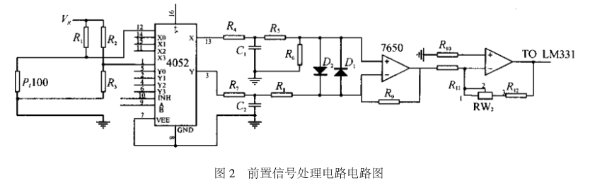 CD4052是双4选1多路模拟开关,其4组输入分别是3路3相绕组温度信号和环境温度信号(可选用),这些信号的切换由程序通过单片机的口线进行控制。因为所检测的温度信号为一缓慢变化的信号。为了有效提高仪器的抗干扰能力,因此进行RC低通滤波。为了提高输入阻抗和高共模抑制比,前置放大器第1级采用差动接法,R4、R5、R6、R7、R8、R9两对电阻要认真选配,且放大器选用微漂移、低失调、高增益高共模抑制比的斩波式自动调零运放TIL7650。第2级反相放大器的放大倍数,通过RW2多圈电位器调整。