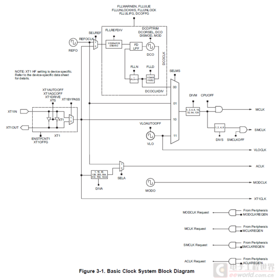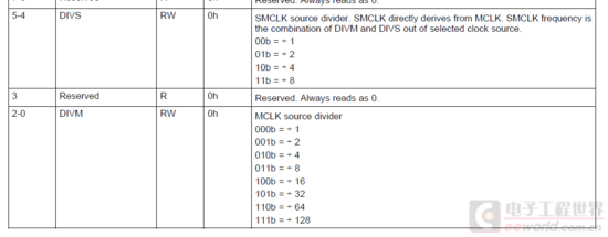 从图中看到SMCLK必须从MCLK分频得到,也就是说MCLK和SMCLK是同步的,但是在其他比如F系列MCU中就可能存在异步模型,因此具体时钟模型,请查看每个芯片的datasheet。