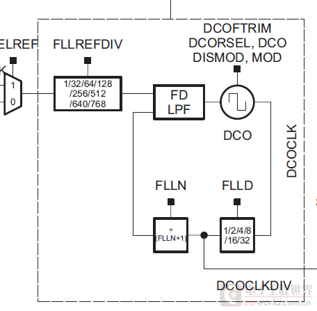 DCOCLK: Internal digitally controlled oscillator,内部数字控制时钟,DCO一般和FLL(锁频环)相结合,可以实现频率的倍增,比如:输入32768KHz,倍频后可实现16MHz。