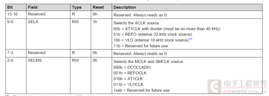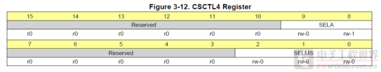 CSCTL4寄存器有两个参数,分别对MCLK/SMCLK,ACLK时钟源进行选择,配置祥情如下: