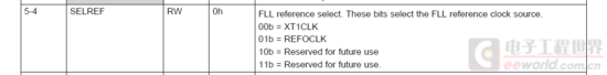 FLLREFDIV:参考时钟分频设置,对于XT1仅能接32768Hz晶振的模型,不分频,这个寄存器没用,对于可以外接高速晶振时,分频后再接入FLL作为参考时钟。