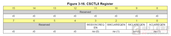 CSCTL8寄存器里包含的是MOD,SMCLK,MCLK,ACLK的Request使能,直接默认即可,会失能MOD,使能MCLK,SMCLK和ACLK。