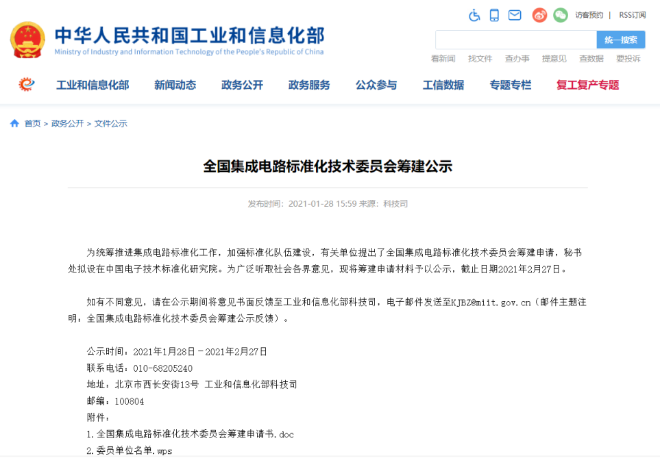 工信部日前发布公告称,为统筹推进集成电路标准化工作,加强标准化队伍建设,有关单位提出了全国集成电路标准化技术委员会筹建申请,秘书处拟设在中国电子技术标准化研究院。为广泛听取社会各界意见,现将筹建申请材料予以公示,截止日期2021年2月27日。