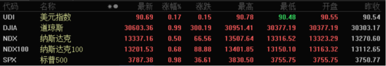 美股方面,道琼斯工业平均指数小幅上涨300.19点,涨幅为0.99%,报30603.36点。纳斯达克综合指数小幅上涨66.56点,涨幅为0.50%,报13337.16点。None小幅上涨36.61点,涨幅为0.98%,报3787.38点。