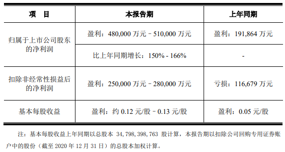 1月29日,京东方发布业绩预告称,公司预计2020年度实现归属于上市公司股东的净利润为48亿元到51亿元,同比增加150%到166%,上年同期净利润为19.19亿元。