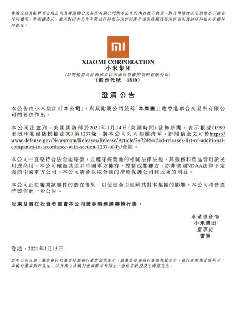随后小米发布公告进行了回应,官方表示公司一直坚持合法合规经营,并遵守经营地的相关法律法规,其服务和产品皆用于民用或商用。公司确认其并非中国军方拥有、控制或关联方,亦非美国NDAA法律下定义的中国军方公司。公司将会采取合适的措施保护公司和股东的利益。