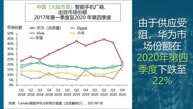 Canalys 评论称,“华为第四季度出货量同比萎缩将近5成,尽管华为产品需求仍然巨大,但在可预见的未来华为并无法满足需求。其他头部厂商纷纷瞄准着这个机会。OPPO、vivo 和小米竞相争夺华为遍布全国的线下渠道资源,其中不乏包括乡镇的渠道伙伴,并在门店扩张和营销支持方面投入巨额资金。这些举措带来了立竿见影的效果,市场份额在短短几个月内迅速上升。积极扩张是 OPPO、vivo 和小米在2021年渠道建设的关键词。”