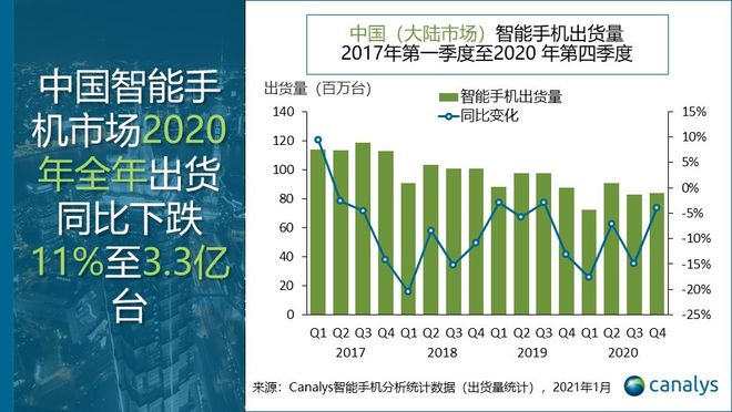1月29日消息 全球技术市场分析与市场咨询机构 Canalys 今日发布2020年第四季度全球智能手机市场研究报告,报告显示,中国大陆智能手机市场2020年第四季度出货量达到8400万部,同比下降4%。2020年全年出货同比下跌11% 至3.3亿台,由于美国制裁导致华为业绩迅速恶化,整体市场复苏步伐遇阻。