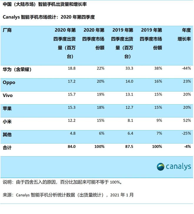 报告显示,2020年第四季度,华为(包括荣耀)出货1880万台,市场份额从2020年第三季度的41% 下降至22%。OPPO 迅速上升至第二位,出货1720万部智能手机,同比增长23%。vivo 也同时取得不错的20% 同比增长,以1570万台排在第三位。苹果也取得近年来在中国的最佳出货表现,第四季度出货量超过1530万台,市场份额为18%,高于2019年第四季度的15%。小米排名第五名,发货量1220万台,同比增长52%。