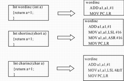 通常,工程师设法使用short或char来定义变量以节省存储器空间。在函数的局部变量数目有限的情况下,编译器会把局部变量分配给内部寄存器,每个变量占用一个寄存器。在这种情况下,使用short和char型变量不但不会节省空间,反而会带来其它的副作用。如图2所示:假定a是任意可能的寄存器,存储函数的局部变量。同样完成加1的操作,32位的int型变量最快,只用一条加法指令。而8位和16位变量,完成加法操作后,还需要在32位的寄存器中进行符号扩展。其中,带符号的变量,要用逻辑左移和算术右移两条指令才能完成符号扩展;无符号的变量,要使用一条逻辑与指令对符号位进行清零。所以,使用32位的int或unsigned int局部变量最有效。某些情况下,函数从外部存储器读入局部变量进行计算,这时候,需要把不是32位的变量转换成32位。至于把8位或16位变量扩展成32位后,隐藏了原来可能溢出异常这个问题,需要进一步仔细考虑。