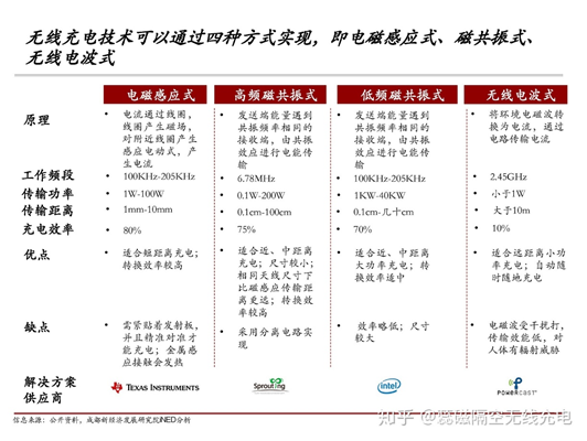 目前无线充电解决方案主要有Qi磁感应式、低频磁共振式、高频磁共振式、无线电波式四种,从官方展示来看,小米采用的应该是无线电波式,充电效率和传输功率都较低。 摩托罗拉采用的可能是高频磁共振式,最远传输距离为1米。